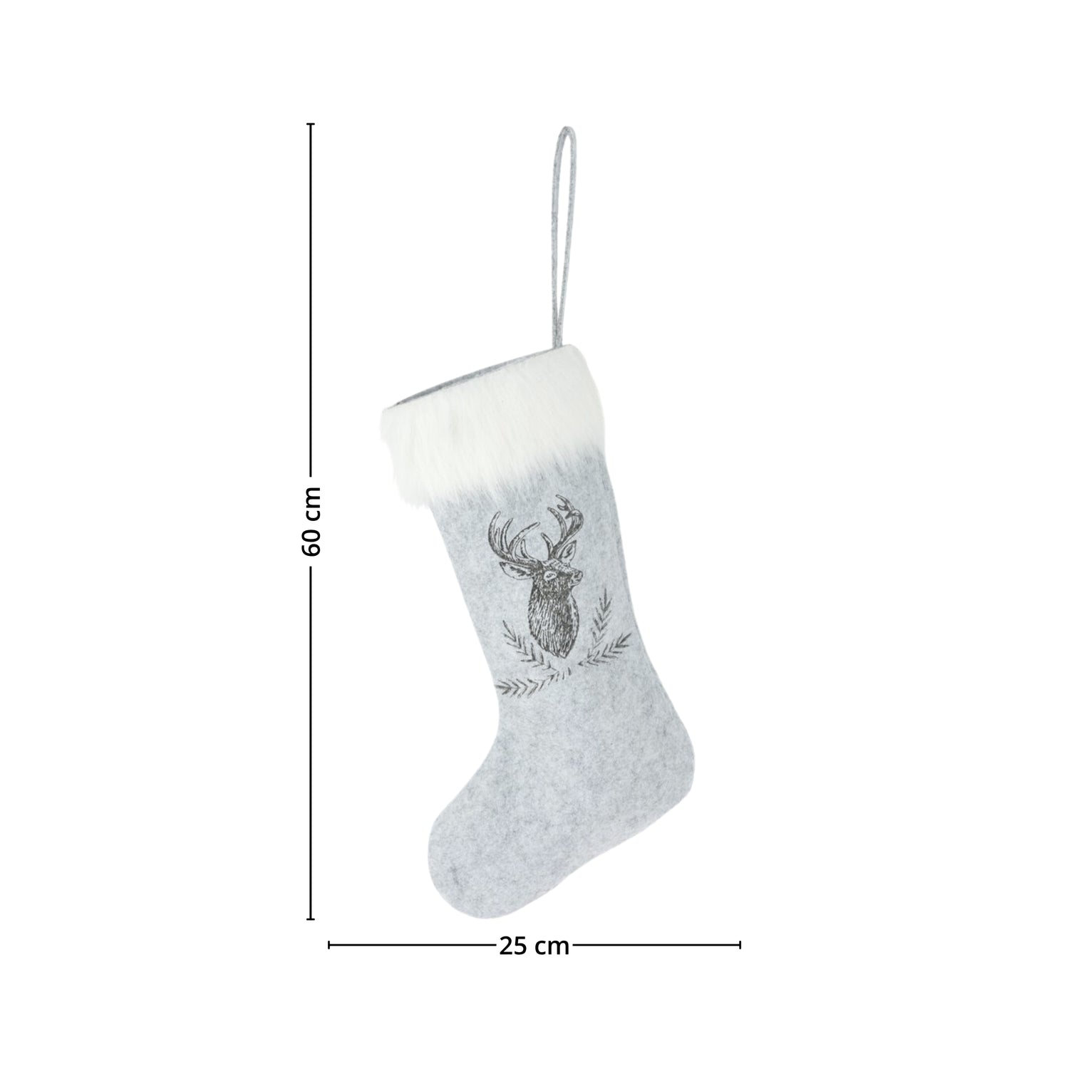 Skap magisk julestemning med denne elegante julestrømpen i grå filt, dekorert med reinsdyrmotiv og myk fuskepelskant. Strømpen gir et delikat uttrykk som passer perfekt i både moderne og tradisjonelle hjem.