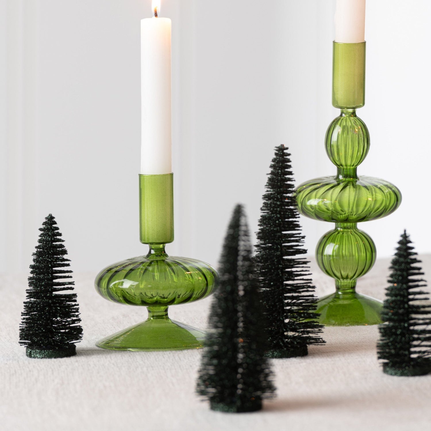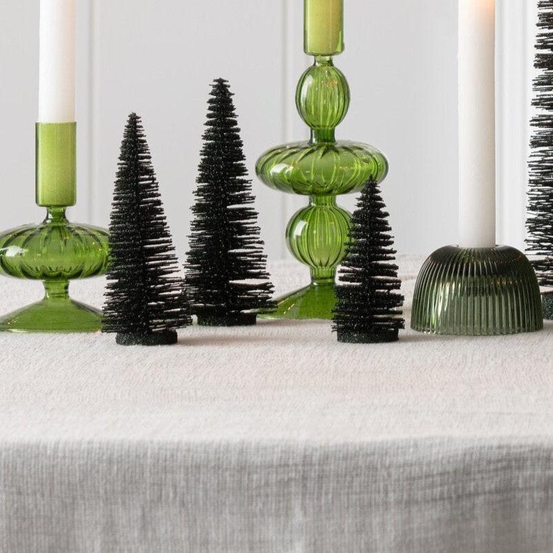 Mørkegrønne miniatyrjuletrær med glitter plassert sammen med grønne lysestaker og tente lys.