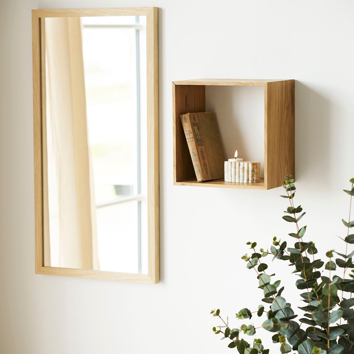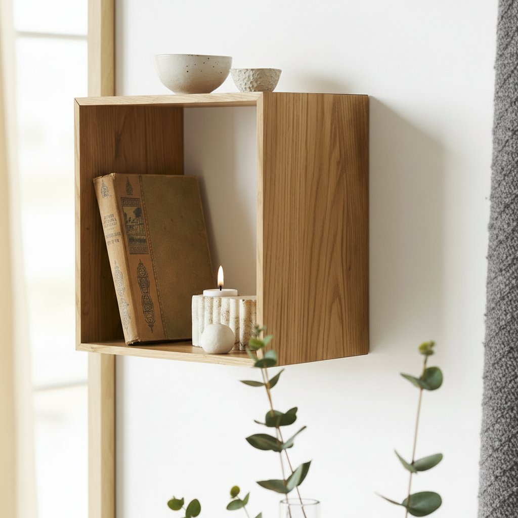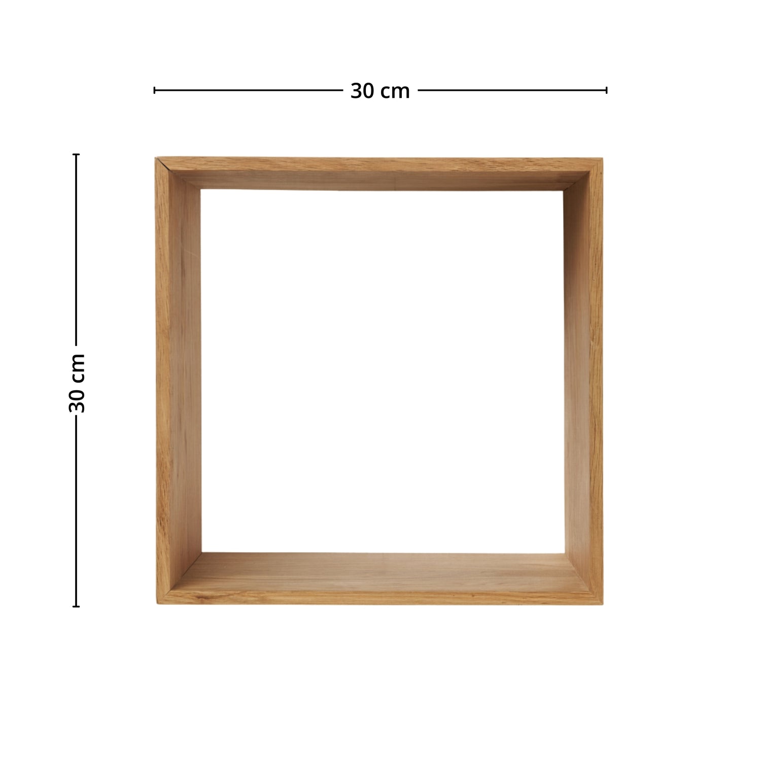 Med mål på 30 cm høyde, 30 cm bredde og 18 cm dybde passer hyllen perfekt til små planter, bøker, lys eller dekor. Den kompakte størrelsen gjør den ideell til mindre veggflater, samtidig som den varme eikefinishen tilfører rommet naturlig karakter.