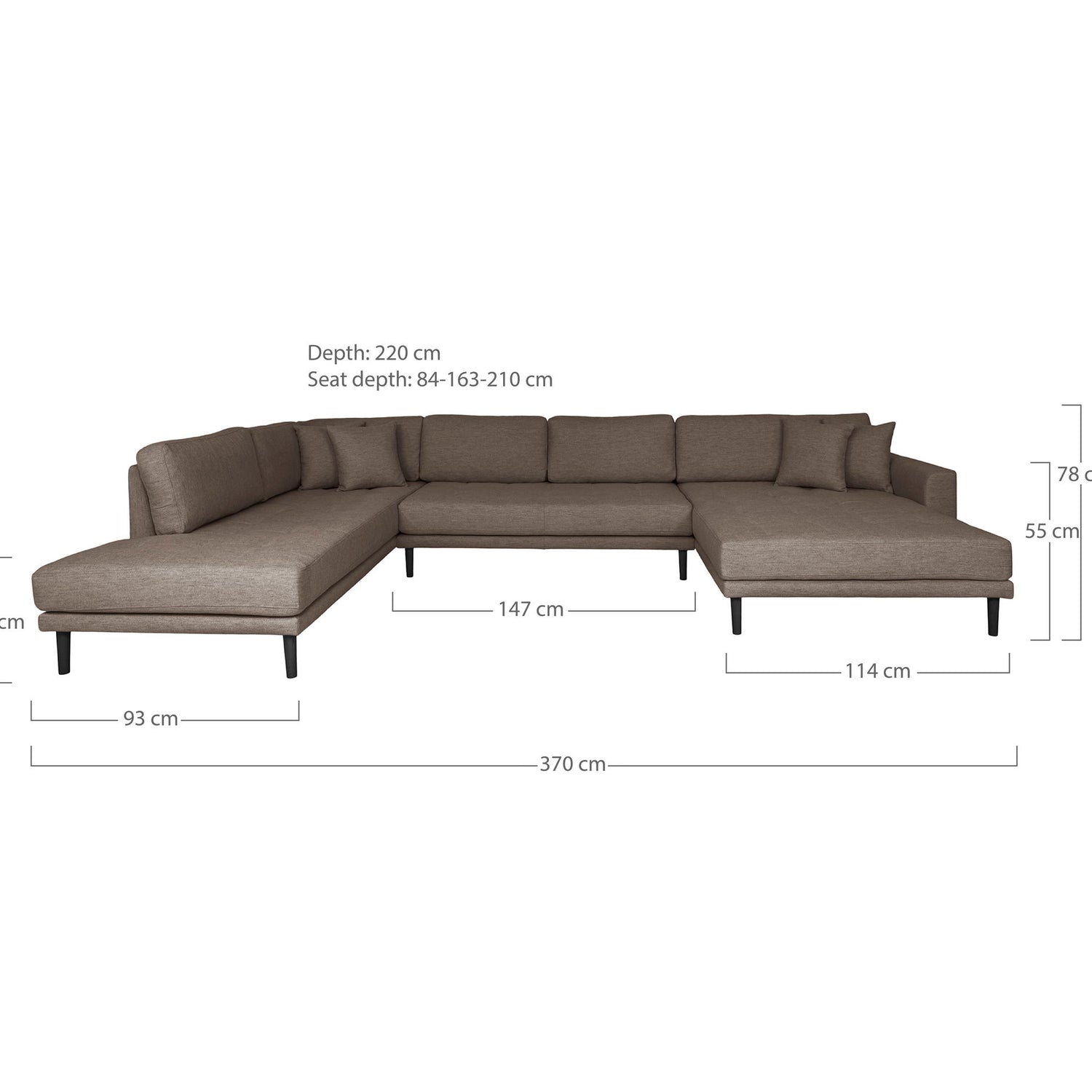 Lido U-Sofa åpen ende i brun tekstil er en romslig og innbydende sofa for deg som ønsker mye sitteplass kombinert med moderne design. Den åpne enden gir en luftig følelse og gjør sofaen til et naturlig samlingspunkt, perfekt for både hverdag og sosiale kvelder med familie og venner.