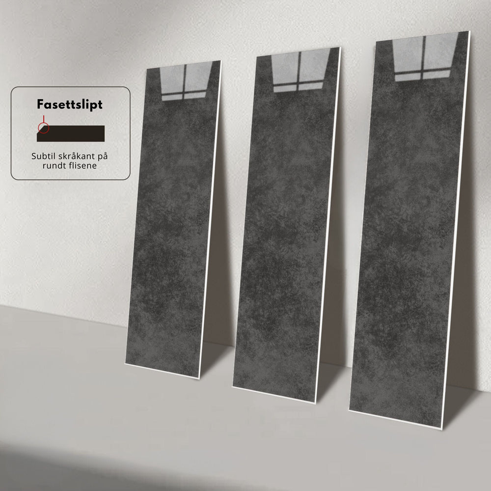 Moderne selvklebende fliser med fasettslipt kant til enkel forvandling av backsplash. Flisene har en høyglanset finish med elegant tekstur som minner om naturlig betong eller stein.