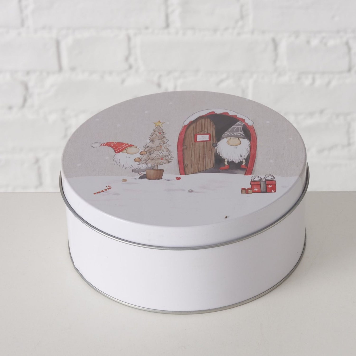 Disse sjarmerende oppbevaringsboksene med julemotiv er den perfekte løsningen for å lagre julebakst, små gaver eller dekorasjoner på en stilfull måte. Settet består av tre runde metallbokser i ulike størrelser, dekorert med koselige nisseillustrasjoner som gir en varm og nostalgisk julefølelse.