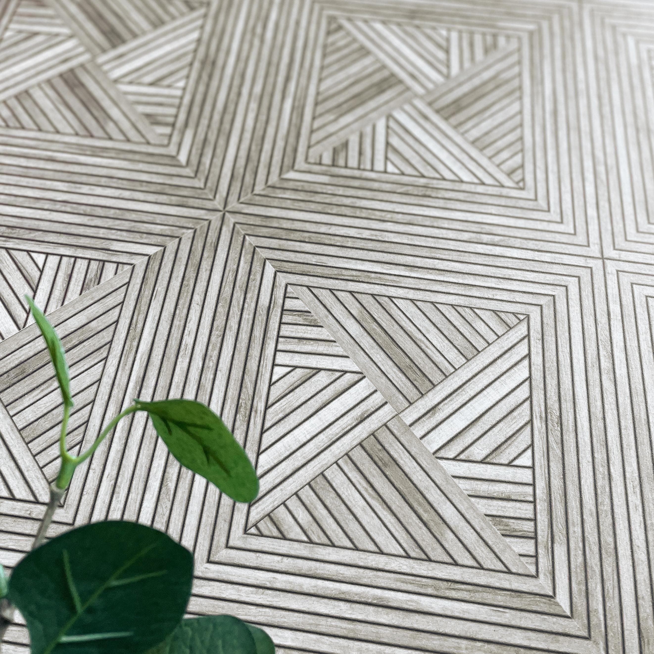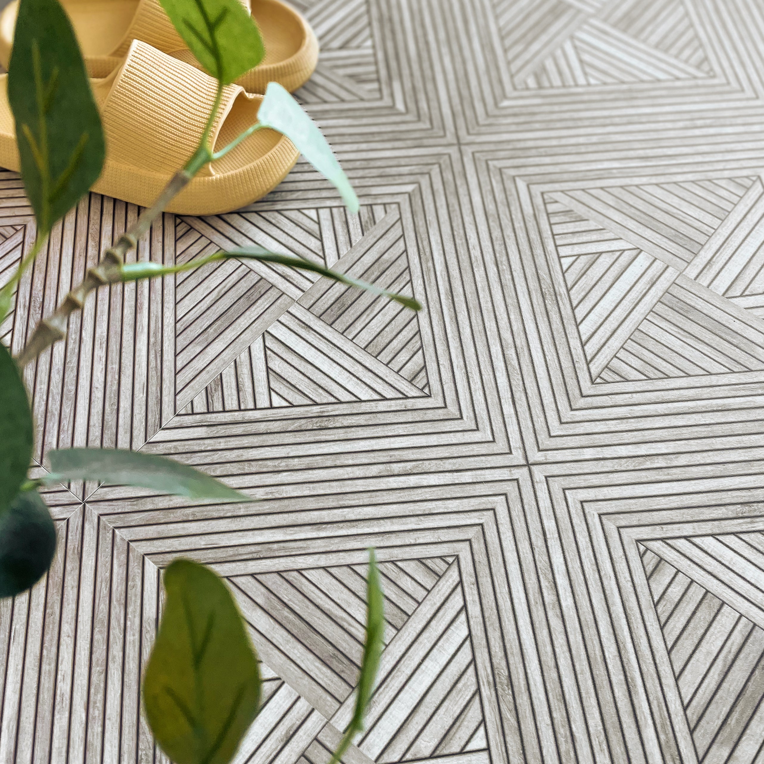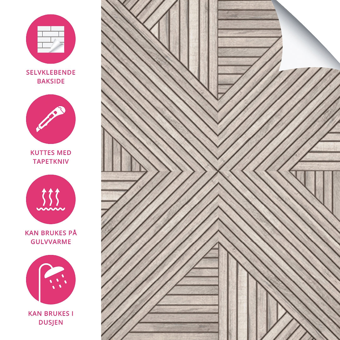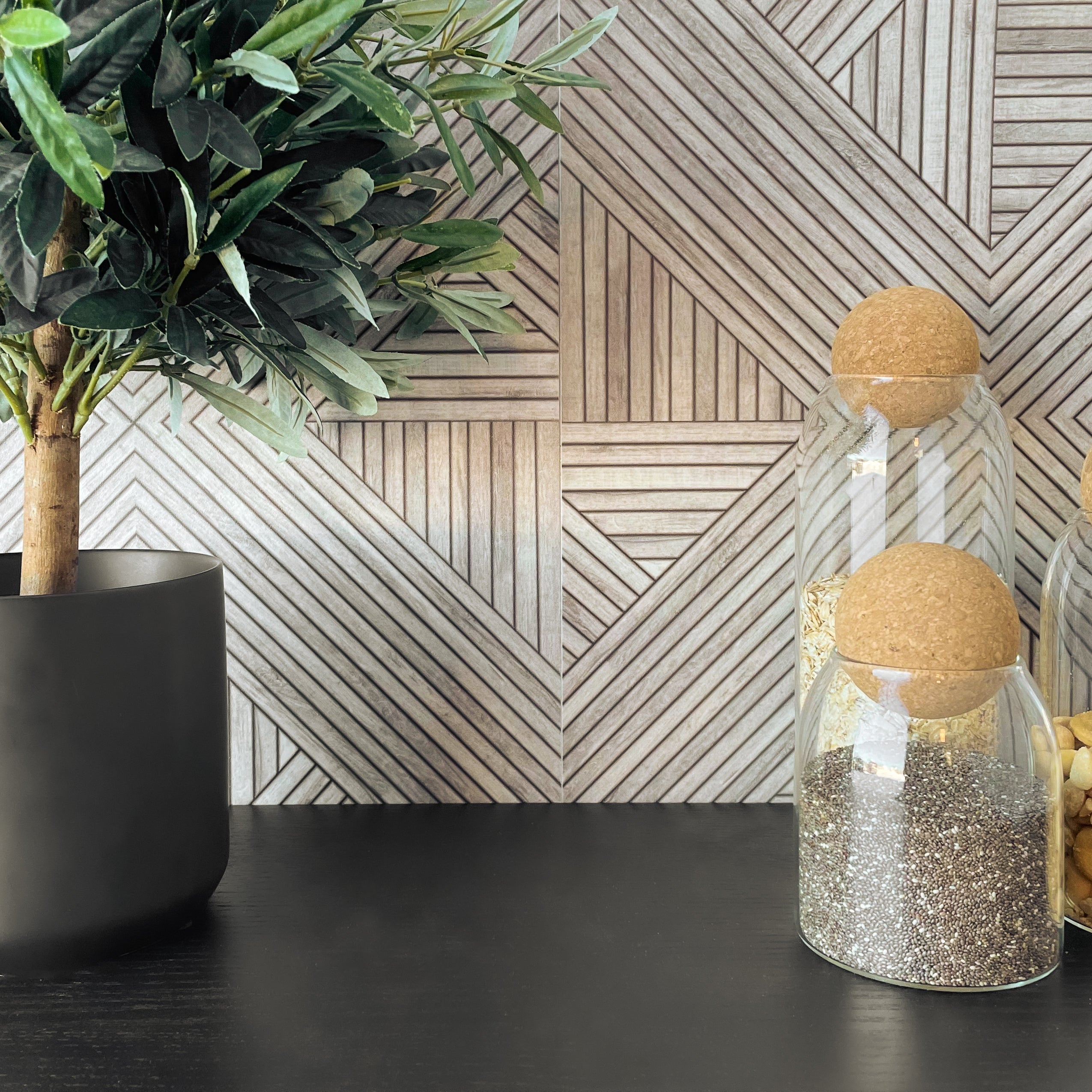 Oda selvklebende fliser kombinerer moderne geometri med det naturlige uttrykket til spilepaneler. Flisene har et unikt design som etterligner tynne spiler arrangert i spennende, symmetriske mønstre.