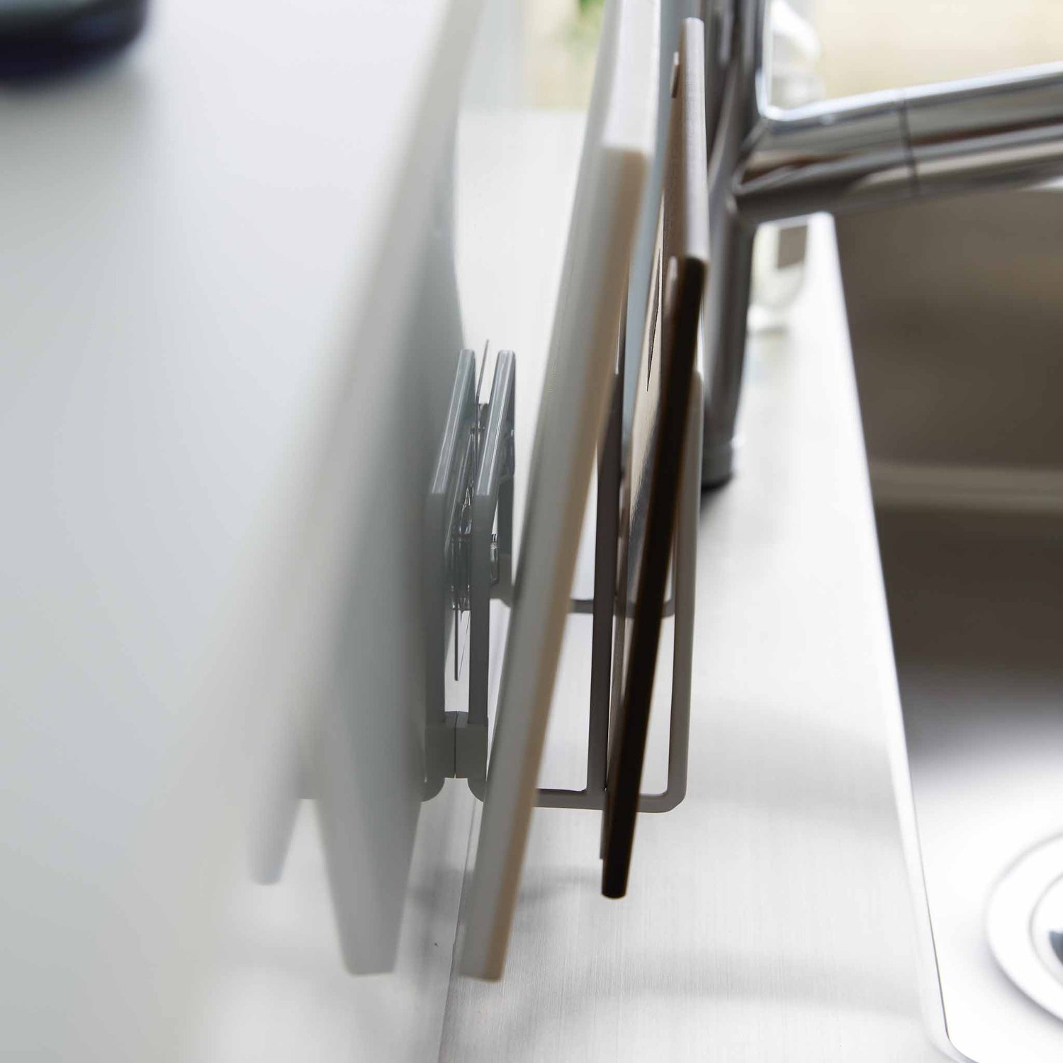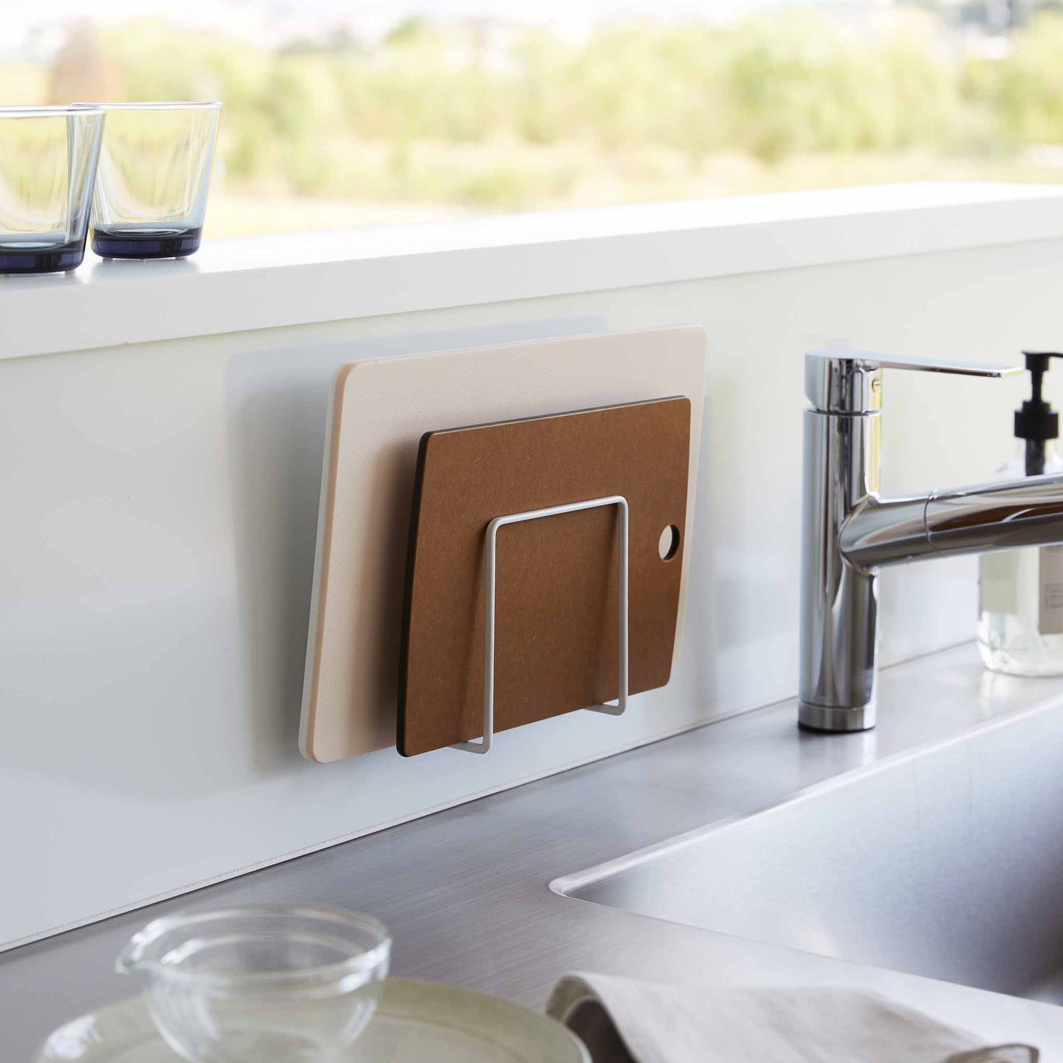 Skjærebrett som står løst på kjøkkenbenken kan fort gjøre kjøkkenet mer rotete enn nødvendig. Med denne selvklebende holderen får du en enkel løsning som samler skjærebrettene på veggen og frigjør verdifull plass rundt matlagingen.