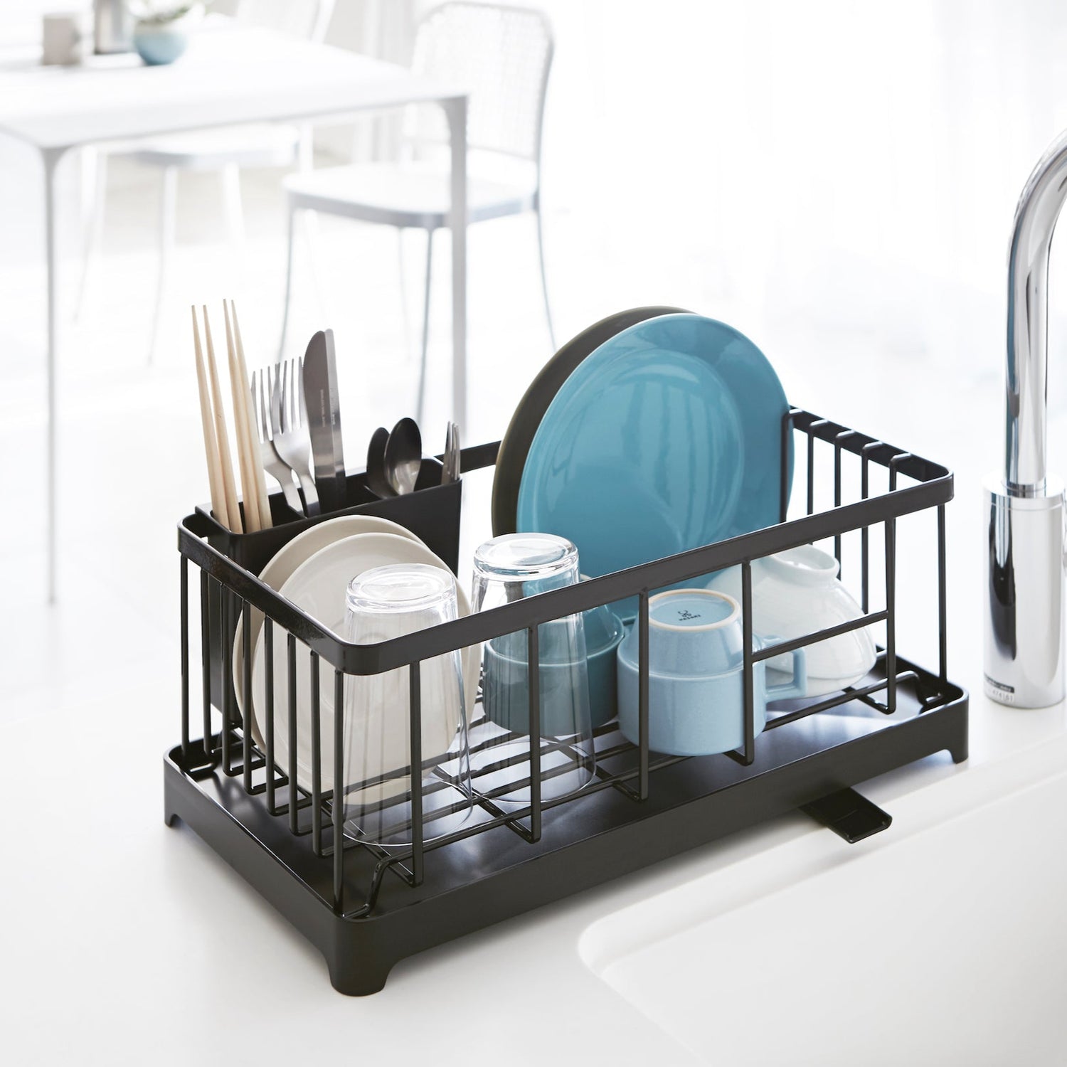 Dette oppvaskstativet i sort metall gir et moderne uttrykk på kjøkkenet ditt. Med en praktisk drypprenne ledes overflødig vann direkte tilbake i vasken, noe som holder benkeplaten tørr og ren.