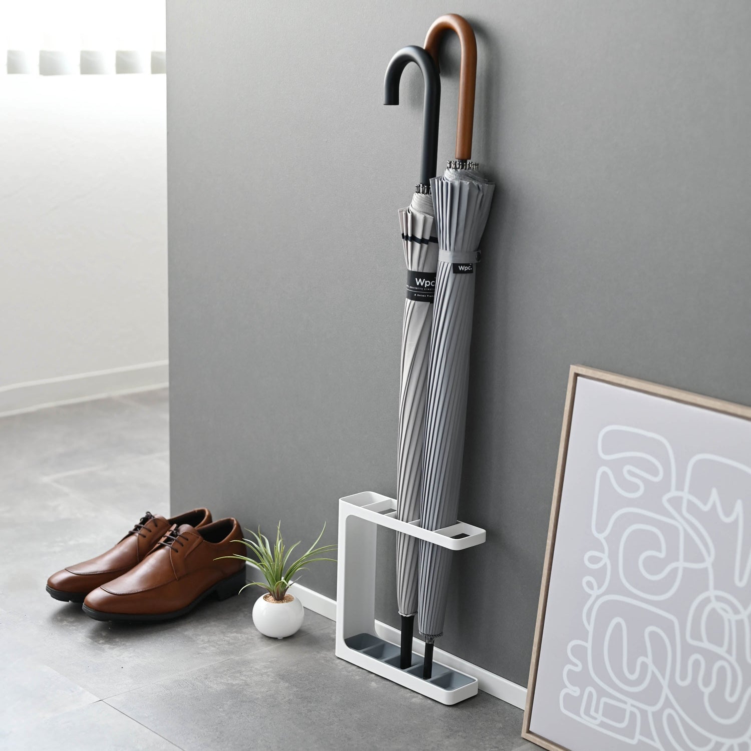 Hold gangen ryddig og tørr med Paraplystativ lite. Det kompakte stativet tar minimalt med plass, men gir praktisk oppbevaring til både paraplyer. Med en moderne og diskret utforming passer det inn i enhver entré, uansett størrelse.