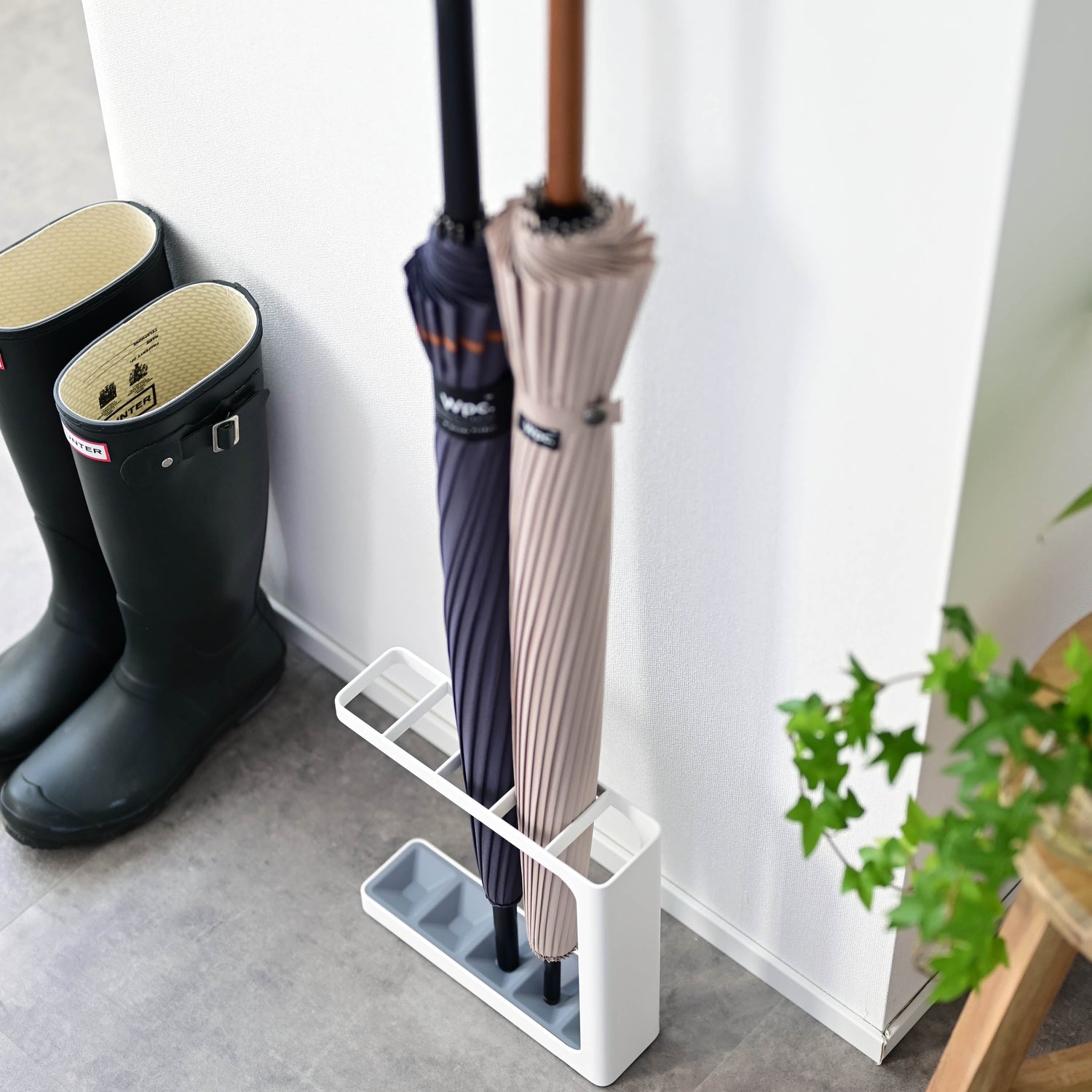 Stativet har dreneringsbunn som gjør at vann samles opp, slik at gulvet holdes rent og tørt selv på regnværsdager. Perfekt for små leiligheter, kontorer eller som en ekstra oppbevaringsløsning i gangen.