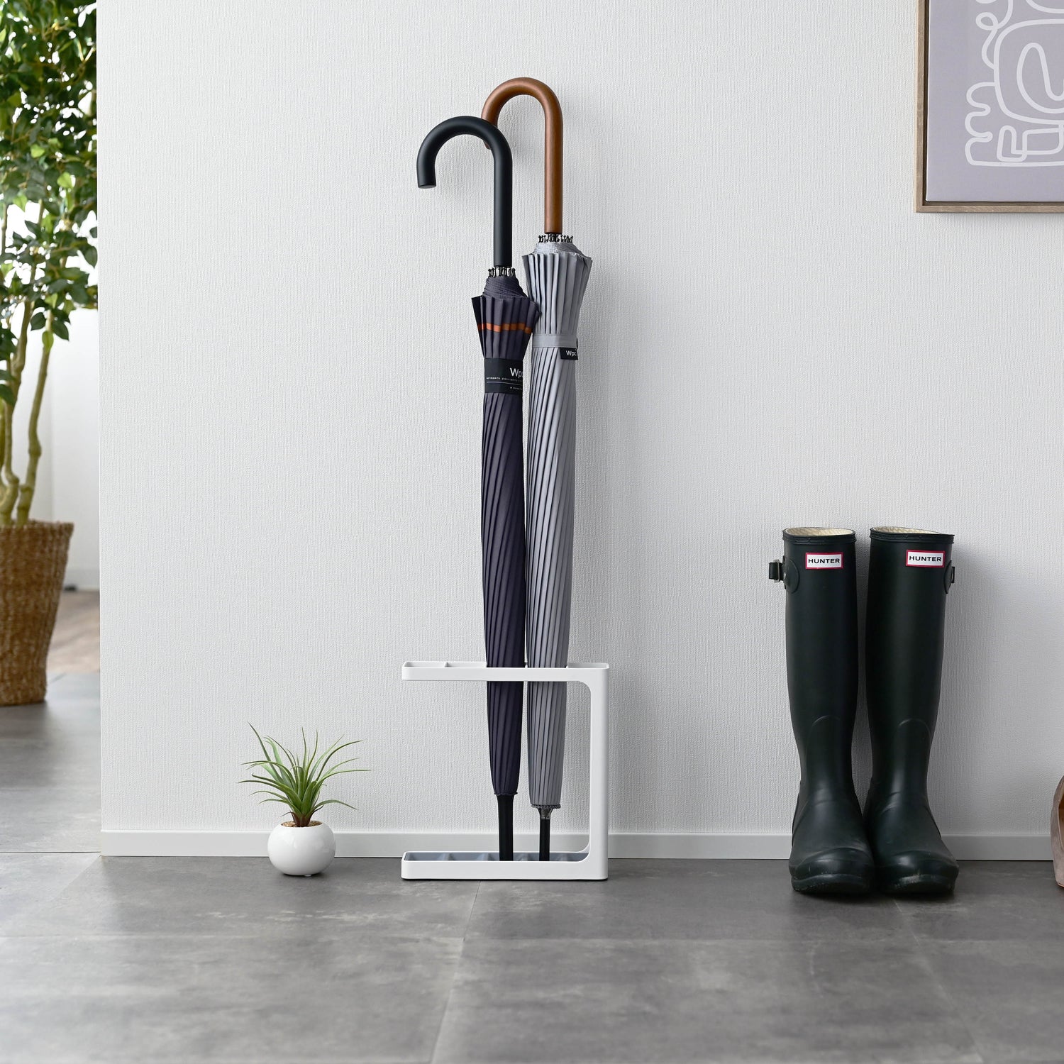 Lite paraplystativ i hvitt med plass til flere paraplyer – perfekt for små ganger.