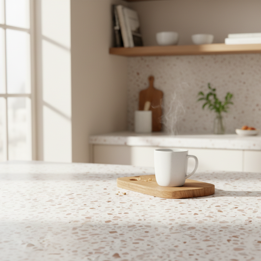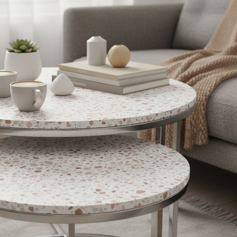 Premium Terrazzo er et populært valg til benkeplater, kommoder, TV-benker, stuebord og spisebord når man ønsker en lys base med varme detaljer.