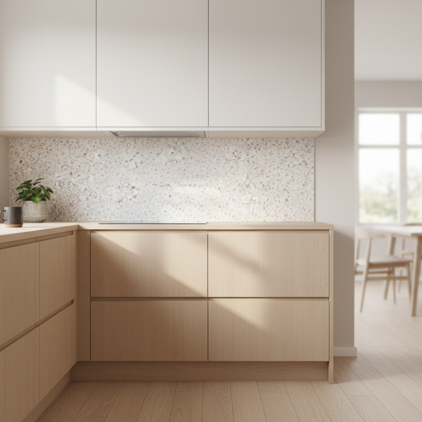 Ønsker du en lys benkeplate med mer liv i overflaten? Premium Terrazzo kontaktplast har en lys base med dempede beige- og bruntoner som gir et naturlig og lunt uttrykk.