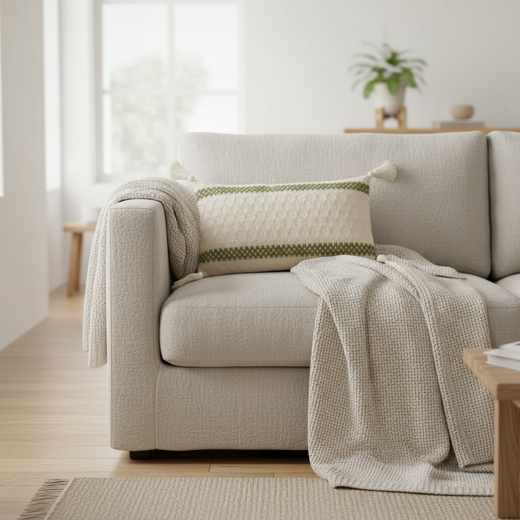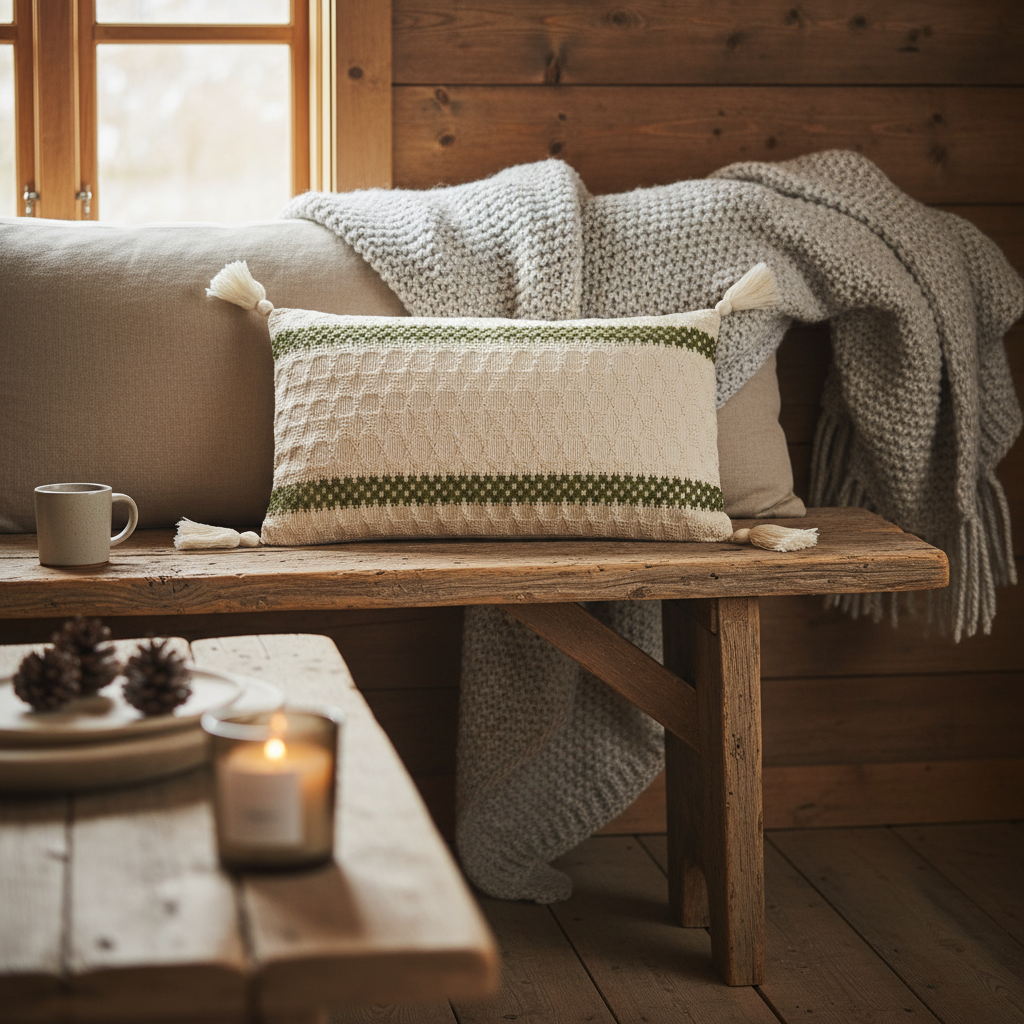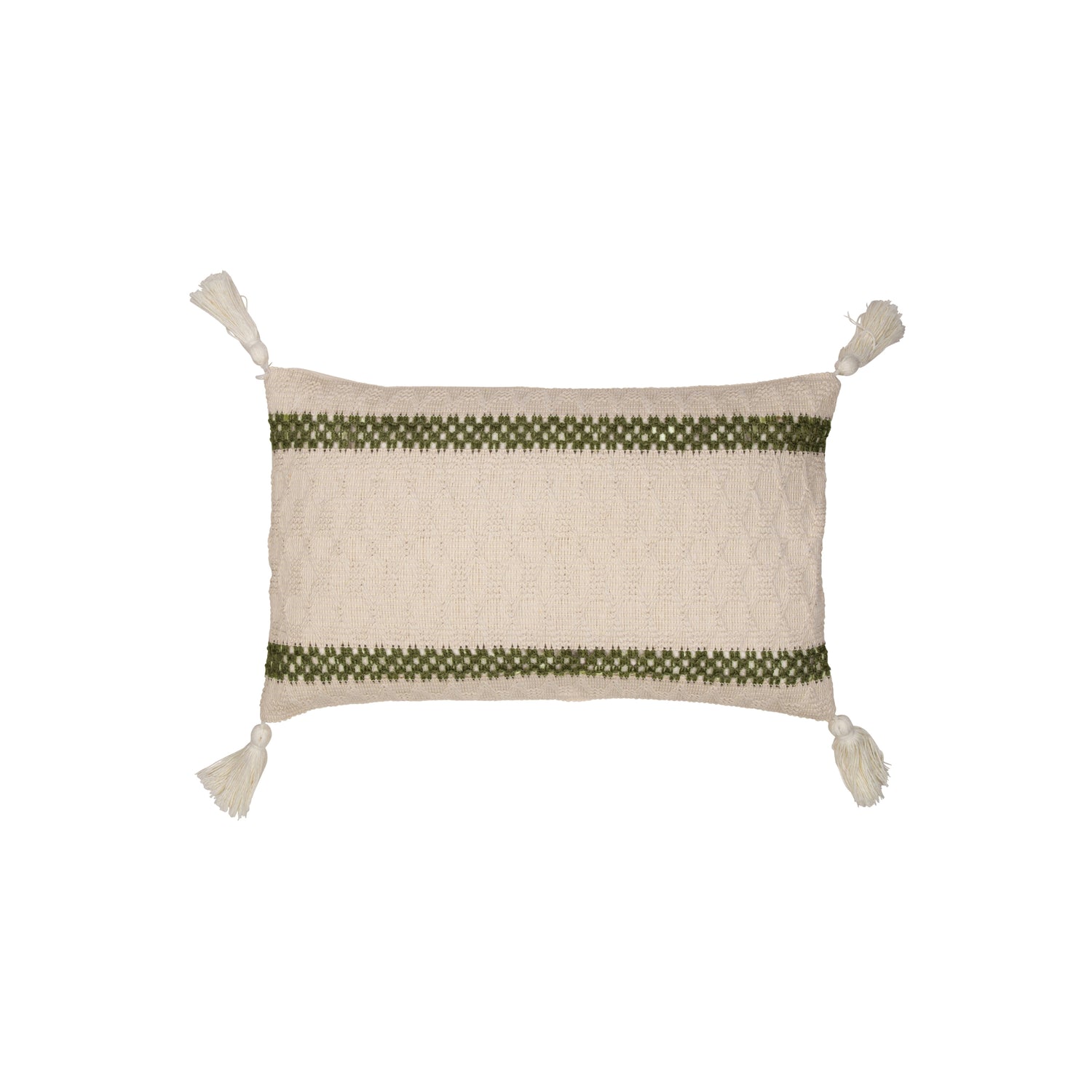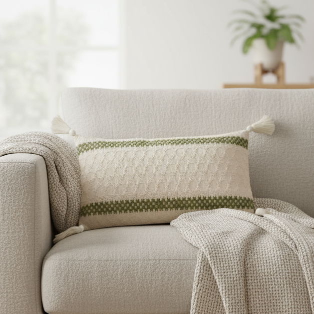 Gi sofaen eller sengen et friskt uttrykk med dette vevde putetrekket i bomull og lin. Det grønne mønsteret gir en rolig og naturlig følelse, mens de små dusene i hjørnene tilfører et mykt og håndlaget preg.
