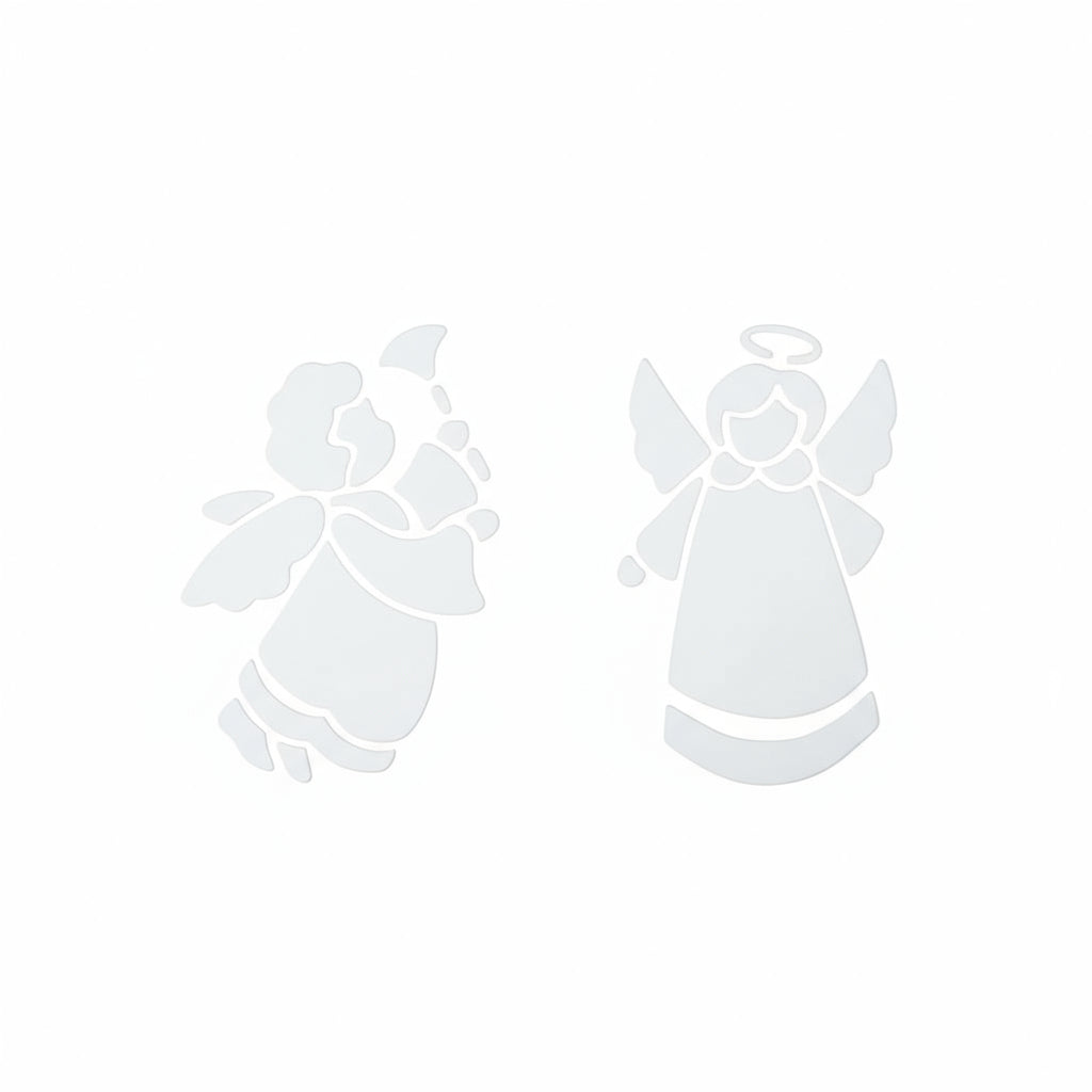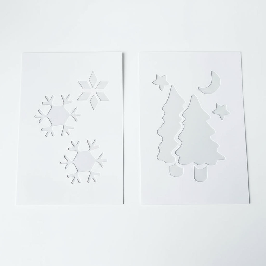 Julesjablongene har mønster med julenisse, snømann og reinsdyr, stjerner, juletrær og snøkrystaller. Perfekt til å lage stemningsfulle og kreative dekorasjoner på vindu, speil eller andre glatte flater.