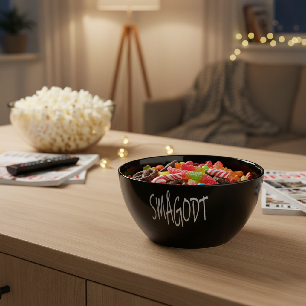 Keramikk, tydelig smågodt tekst og en størrelse som passer godt til servering gjør dette til en skål som både er nyttig i hverdagen og fin å ha stående fremme. Den sorte fargen gir et markert uttrykk som passer godt sammen med både lyse og mørke interiører, og gjør skålen enkel å bruke til mer enn bare smågodt.
