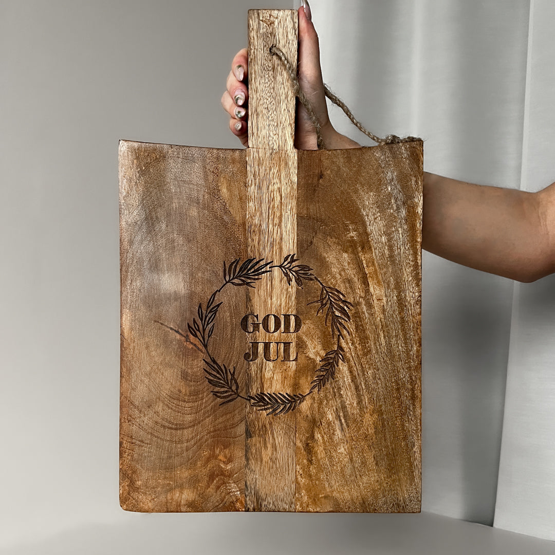 Gjør matlagingen ekstra hyggelig i juletiden med vår vakre skjærefjøl av mangotre, dekorert med 'God Jul'-motiv. Med en størrelse på 40 cm høy, 25 cm bred, er denne fjølen både funksjonell og dekorativ.