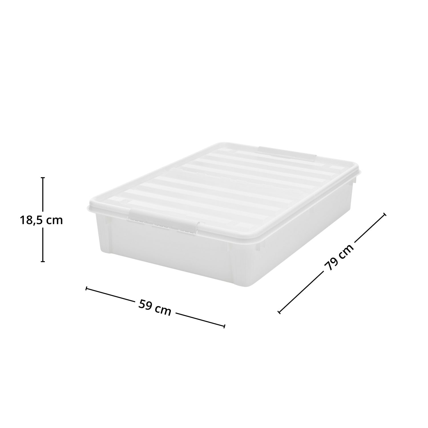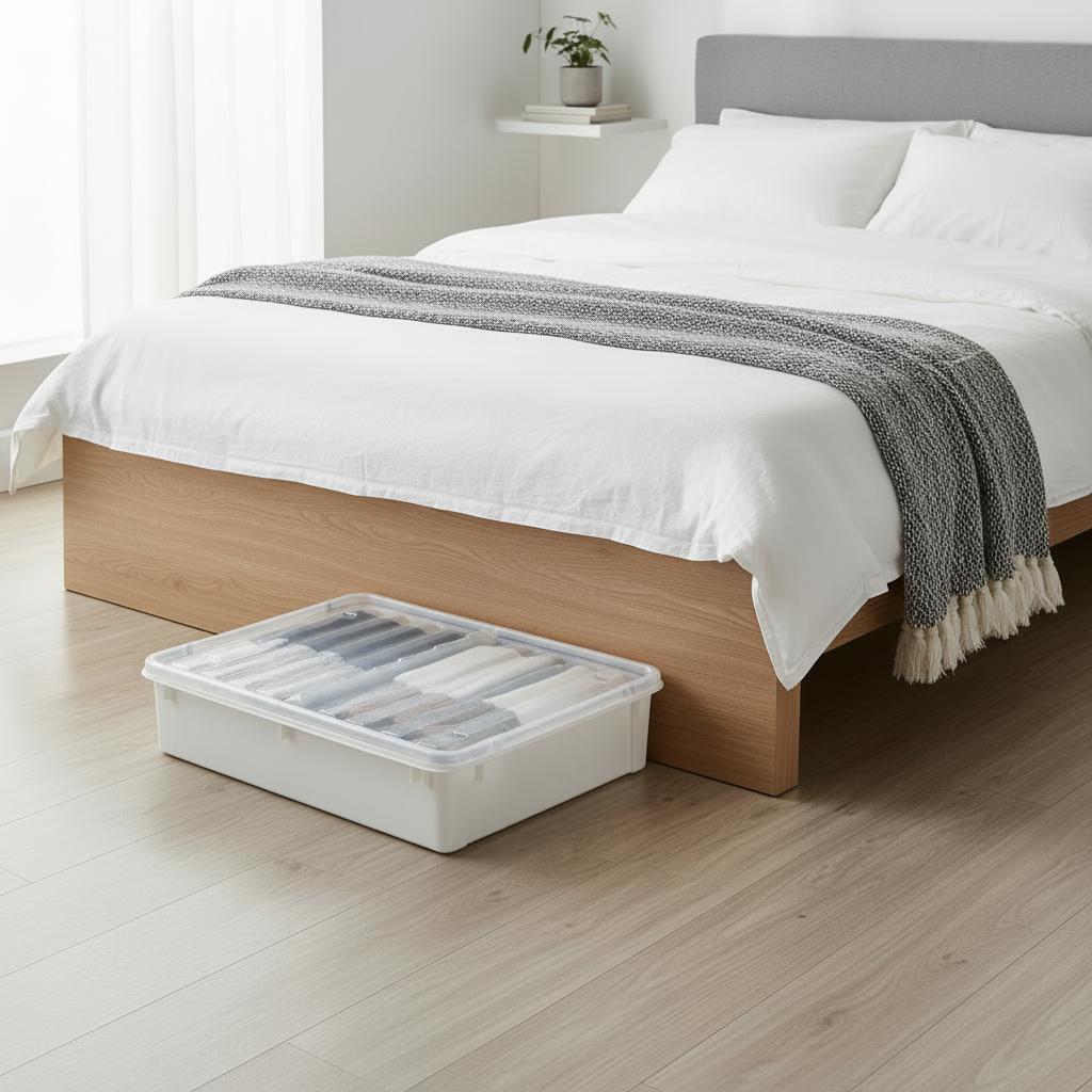 Du får en romslig oppbevaringsboks på 60 liter med hjul som gjør den enkel å trekke ut og skyve tilbake under sengen. Den lave høyden gjør at boksen passer under de fleste senger, samtidig som volumet gir god plass til klær, sengetøy, tepper eller sesongbaserte tekstiler.