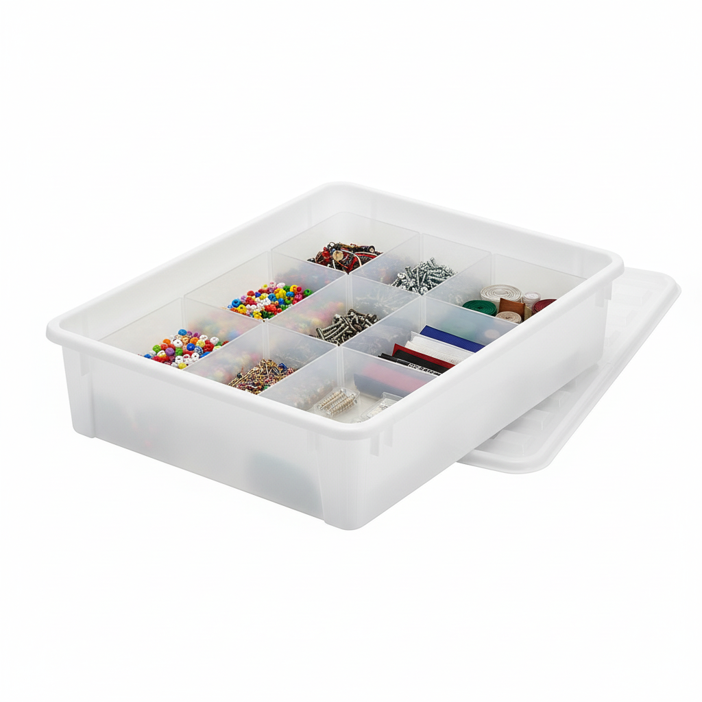 Det transparente lokket gjør det lett å se hva som ligger i boksen, mens solide klips holder lokket trygt på plass. Lokket kan åpnes selv når boksen bare trekkes delvis ut, noe som gjør den praktisk også i trange rom.