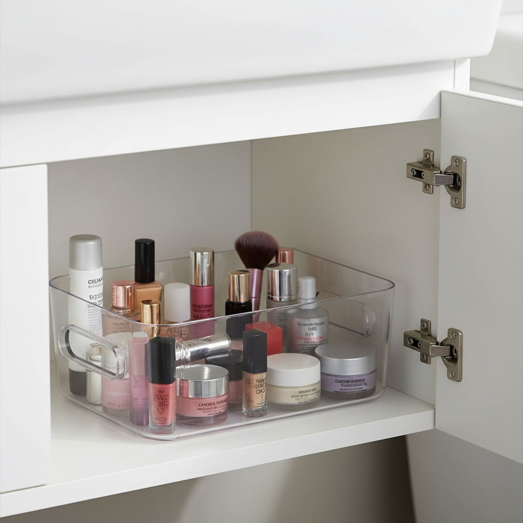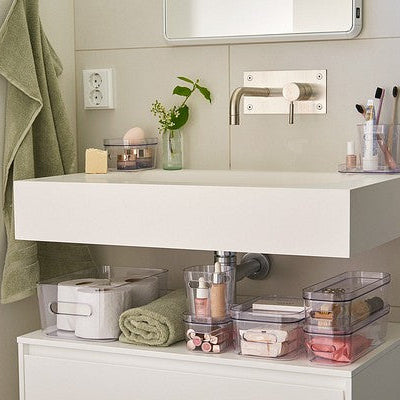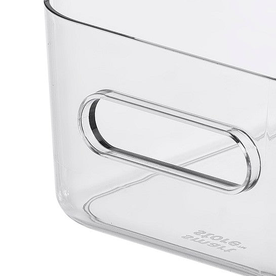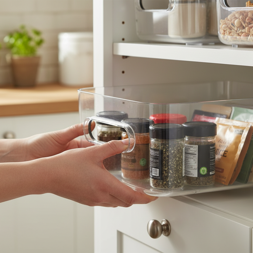 Den kompakte størrelsen passer perfekt til organisering av småting som krydder, snacks, kosmetikk, kontorutstyr eller rengjøringsartikler. Integrerte håndtak gjør boksen enkel å løfte, trekke ut og flytte, noe som gjør den praktisk i både kjøkkenskap, hyller og skuffer.