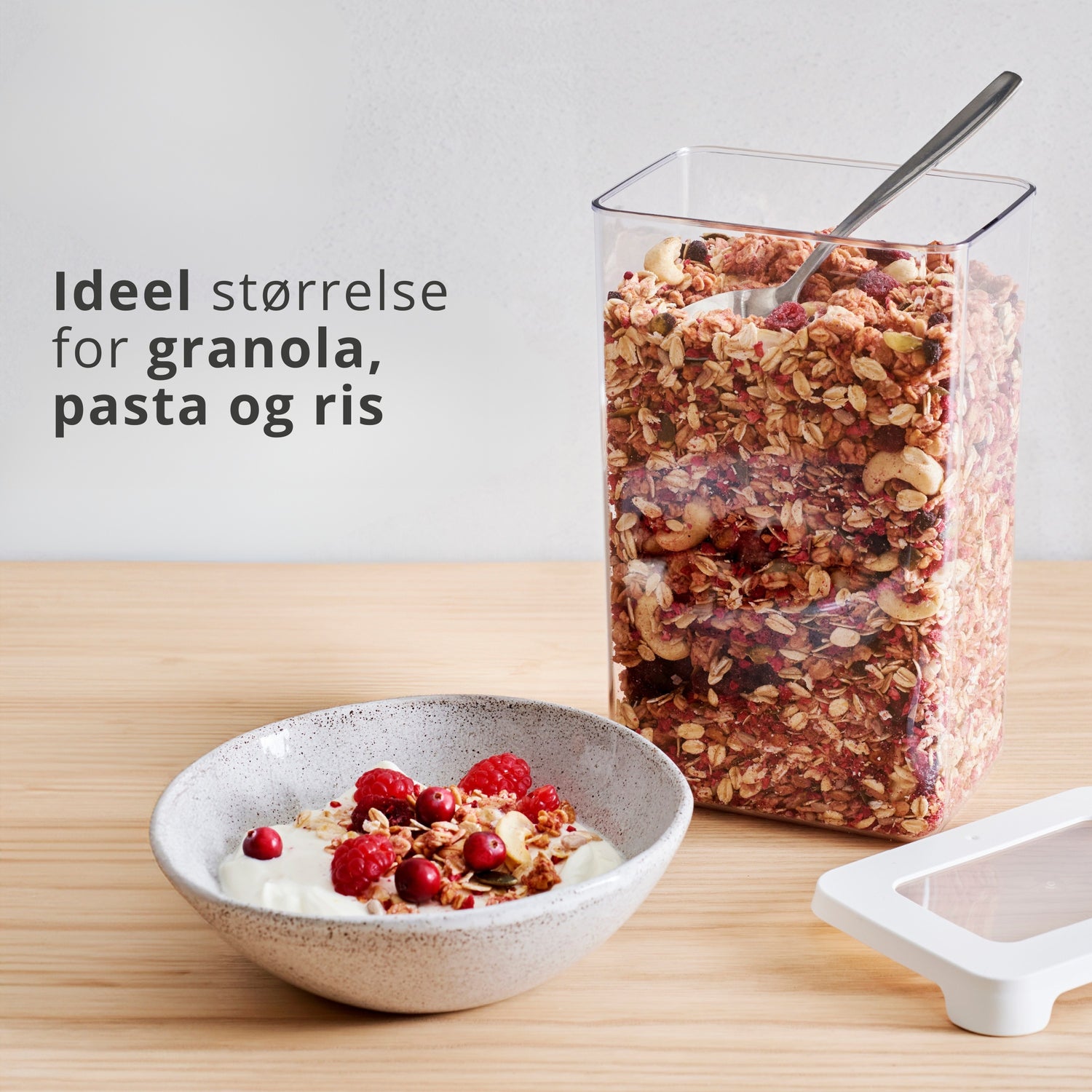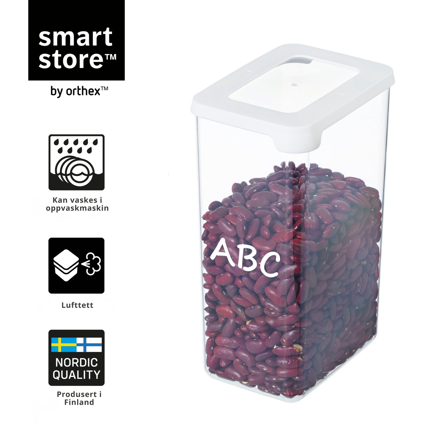 Med 1,6 liters kapasitet passer den perfekt til oppbevaring av pasta, ris, sukker, havregryn og andre tørrvarer. Beholderen kan også merkes direkte med en tusj dersom du ønsker et enda mer organisert kjøkken.