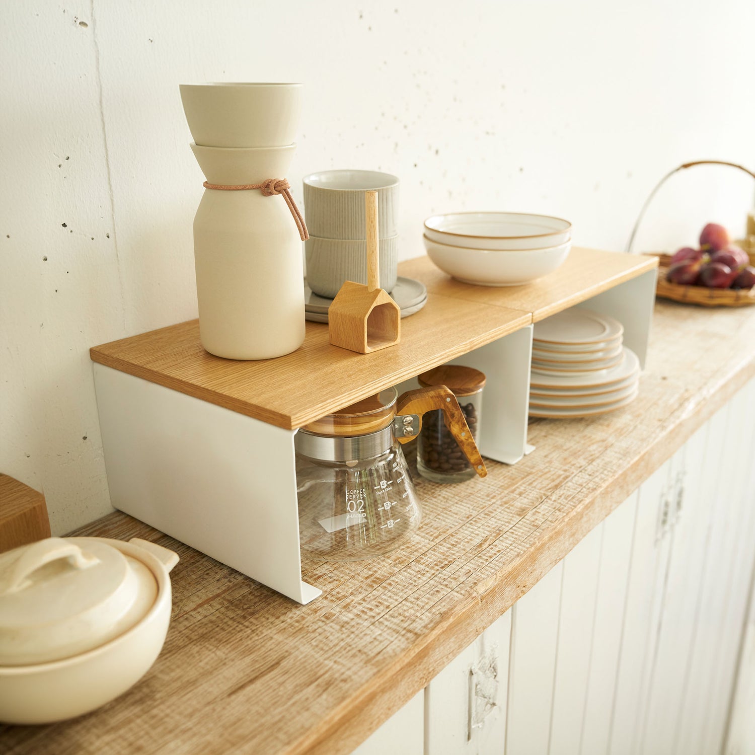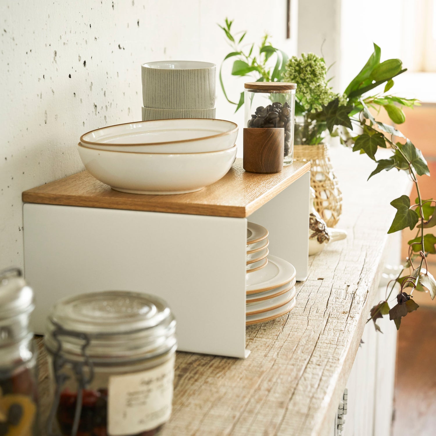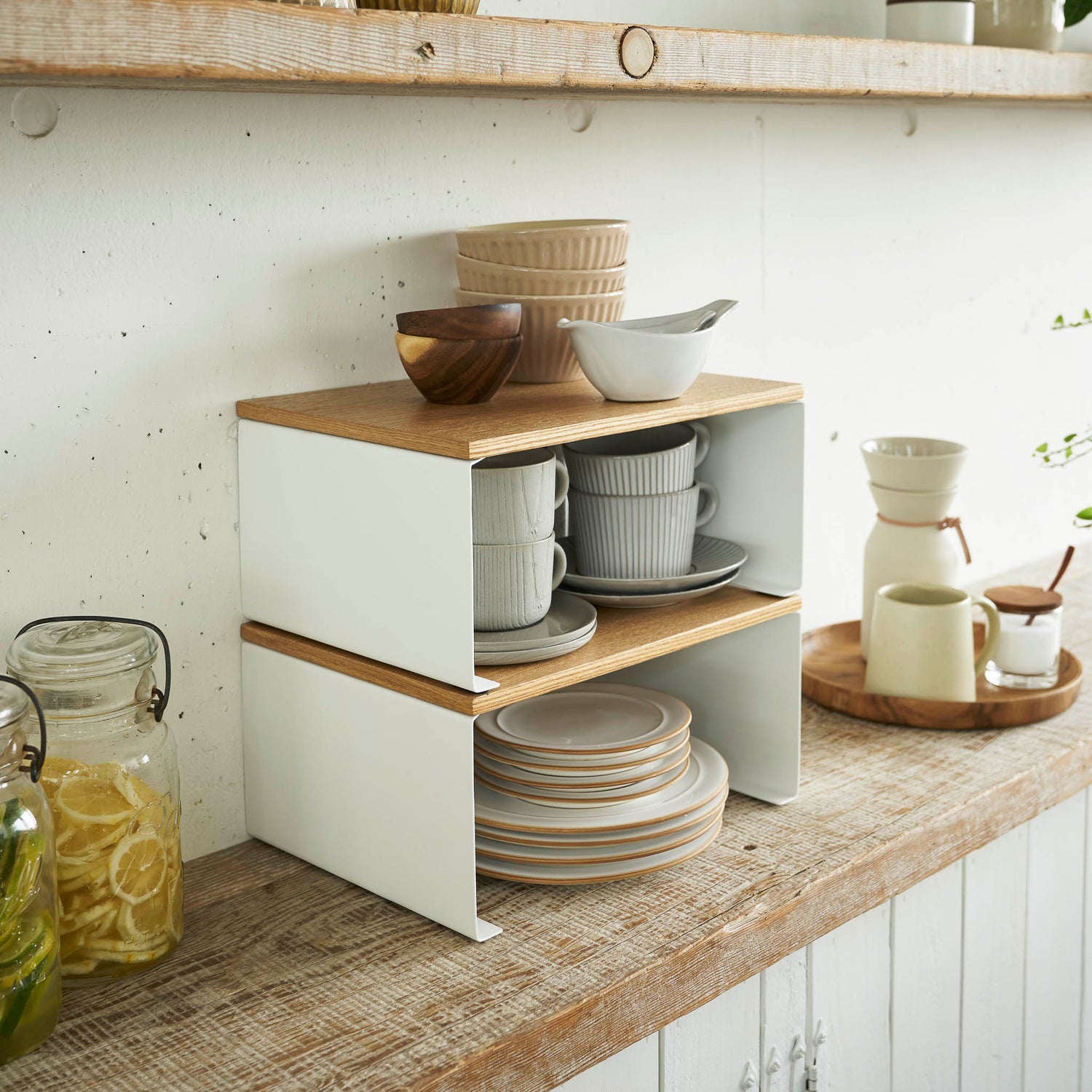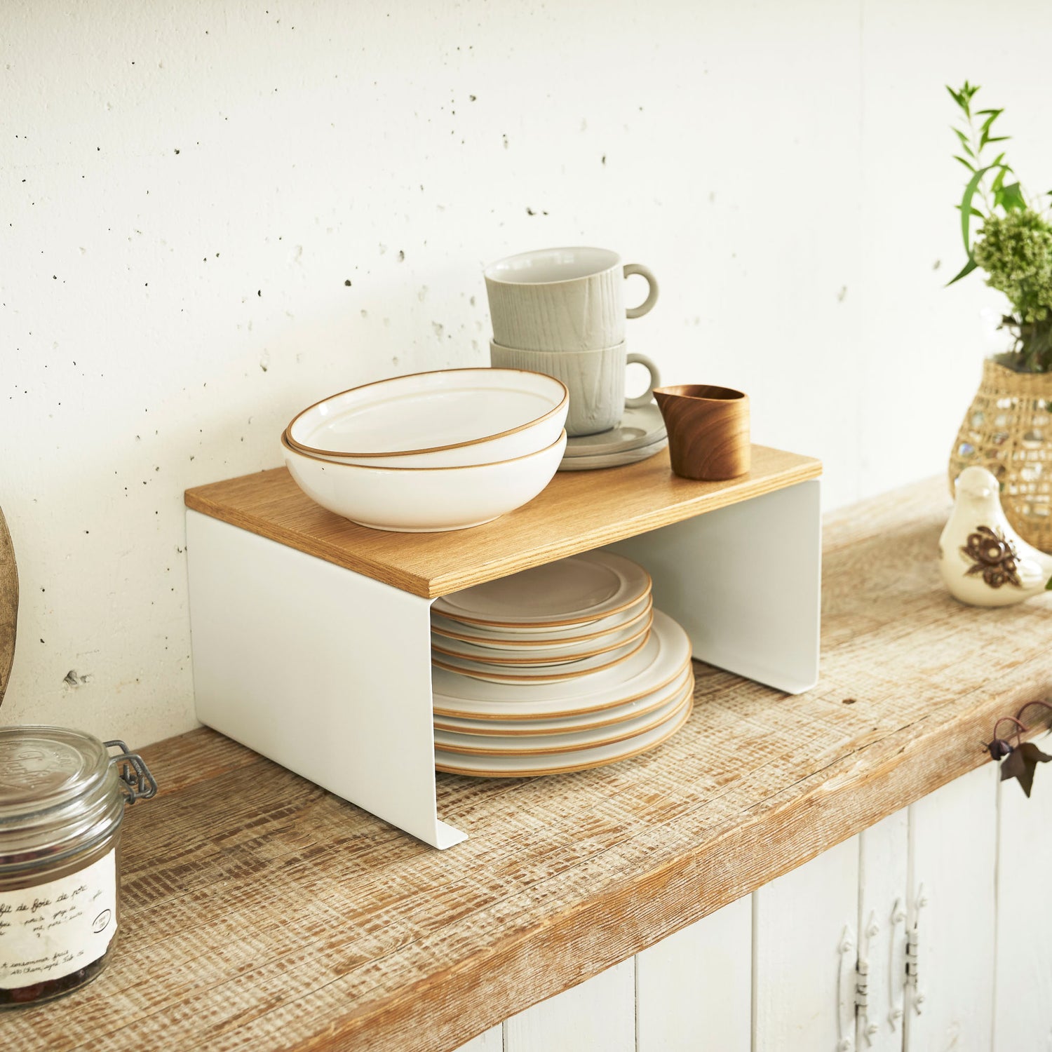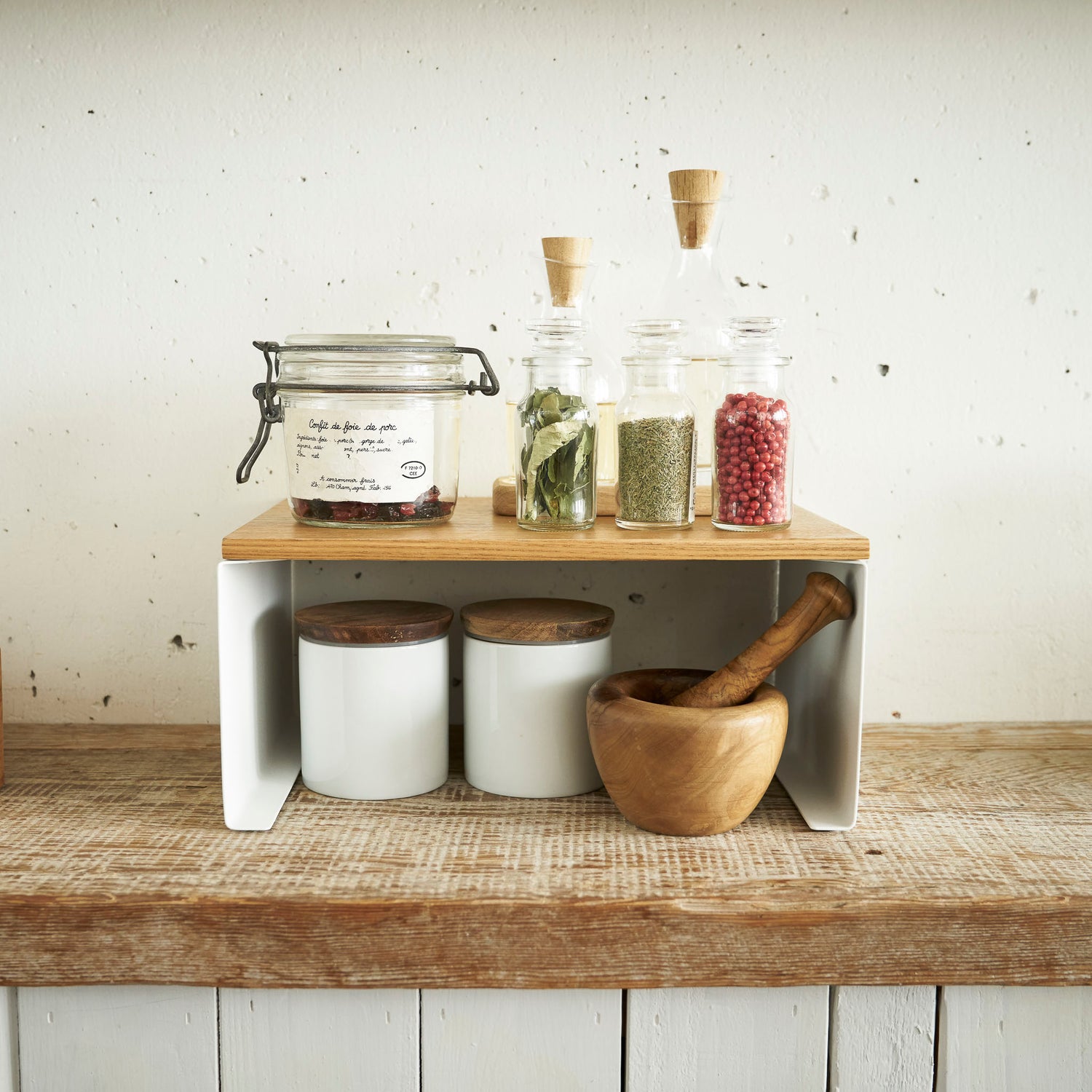 Denne kjøkkenhyllen hjelper deg å utnytte plassen bedre i skap og på benk. Den stablebare konstruksjonen gir fleksibel oppbevaring, slik at du enkelt kan bygge høyde og få oversikt over skåler, kopper og krydder.