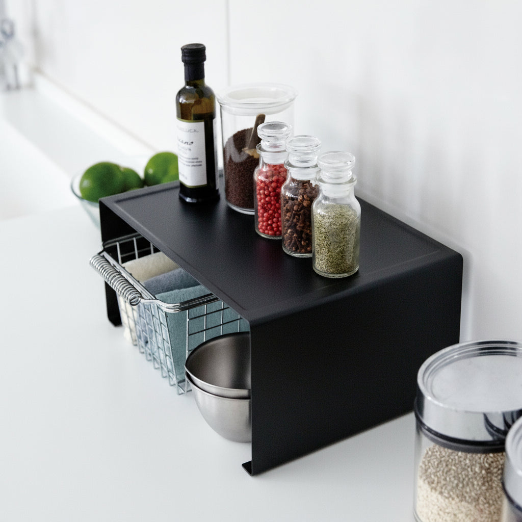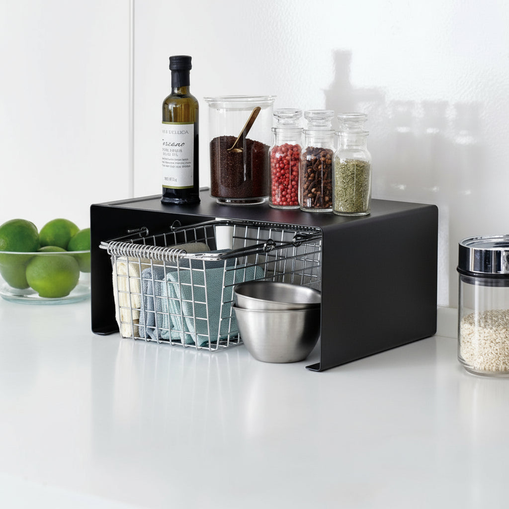 Den brede kjøkkenhyllen i sort er en smart oppbevaringsløsning som hjelper deg med å organisere kjøkkenbenken eller skapene dine effektivt.