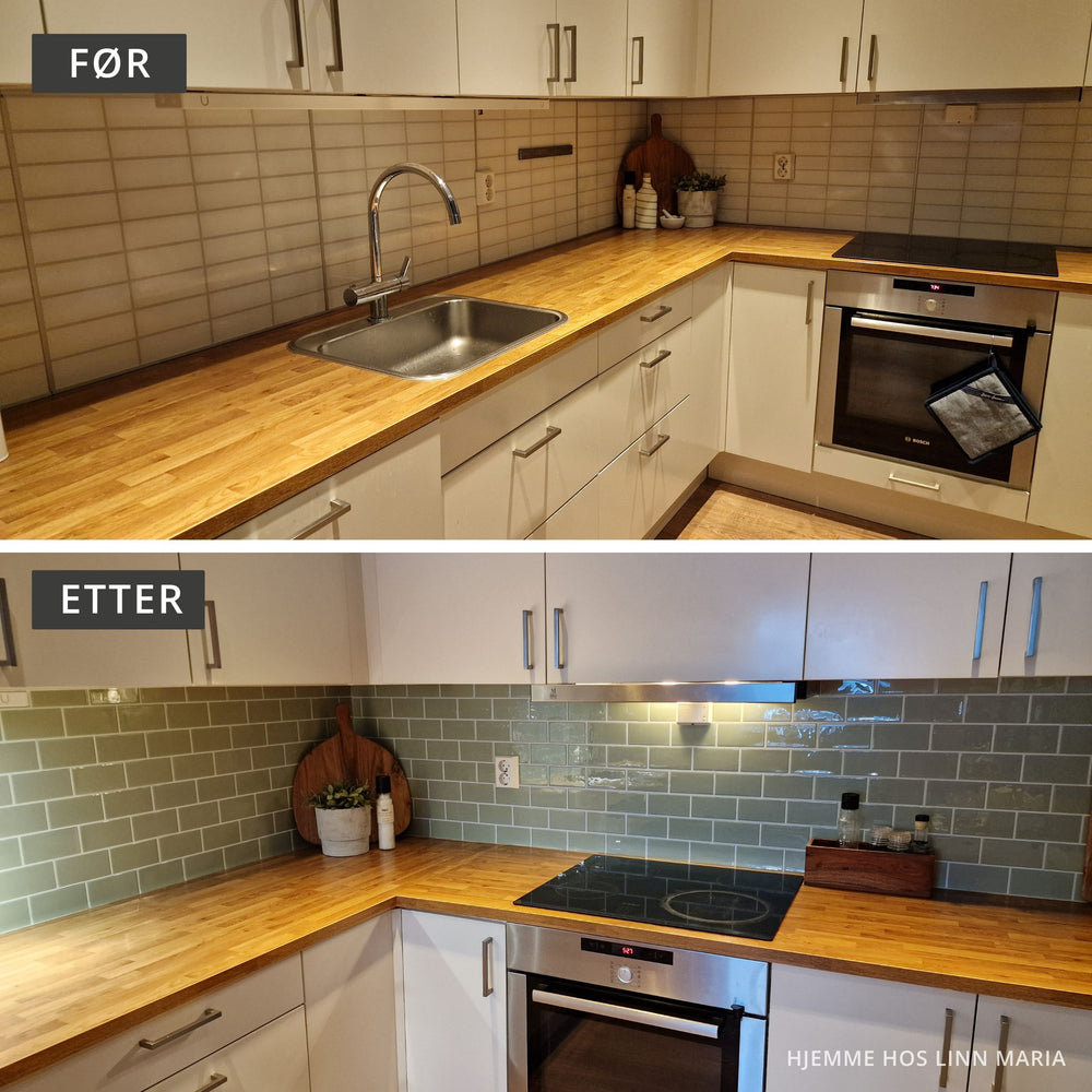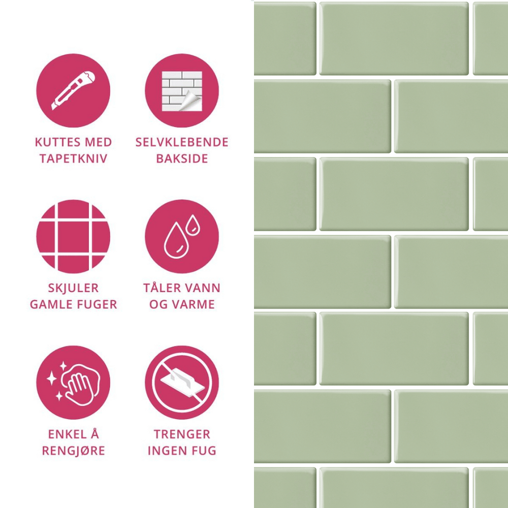 Gi kjøkkenet eller badet en moderne oppgradering med Subway selvklebende fliser i sage green. Disse flisene etterligner klassiske subway-fliser og kommer i en lys grønn nyanse med hvite fuger som skaper et friskt uttrykk. Den glansede finishen gir rommet en luksuriøs følelse. Perfekt for deg som ønsker en rask, rimelig og enkel oppussing uten håndverker.