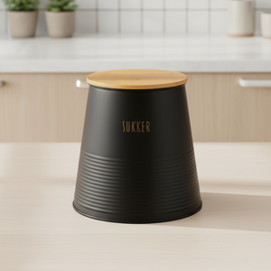 Praktisk oppbevaringsboks til sukker, laget i sort metall med lokk i naturbambus.