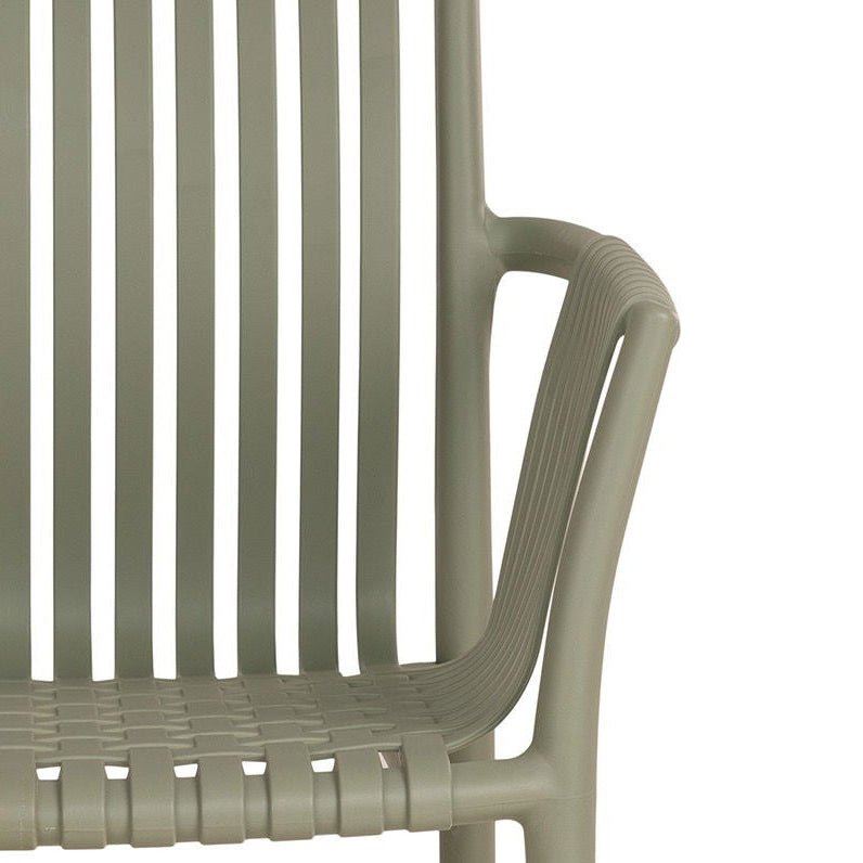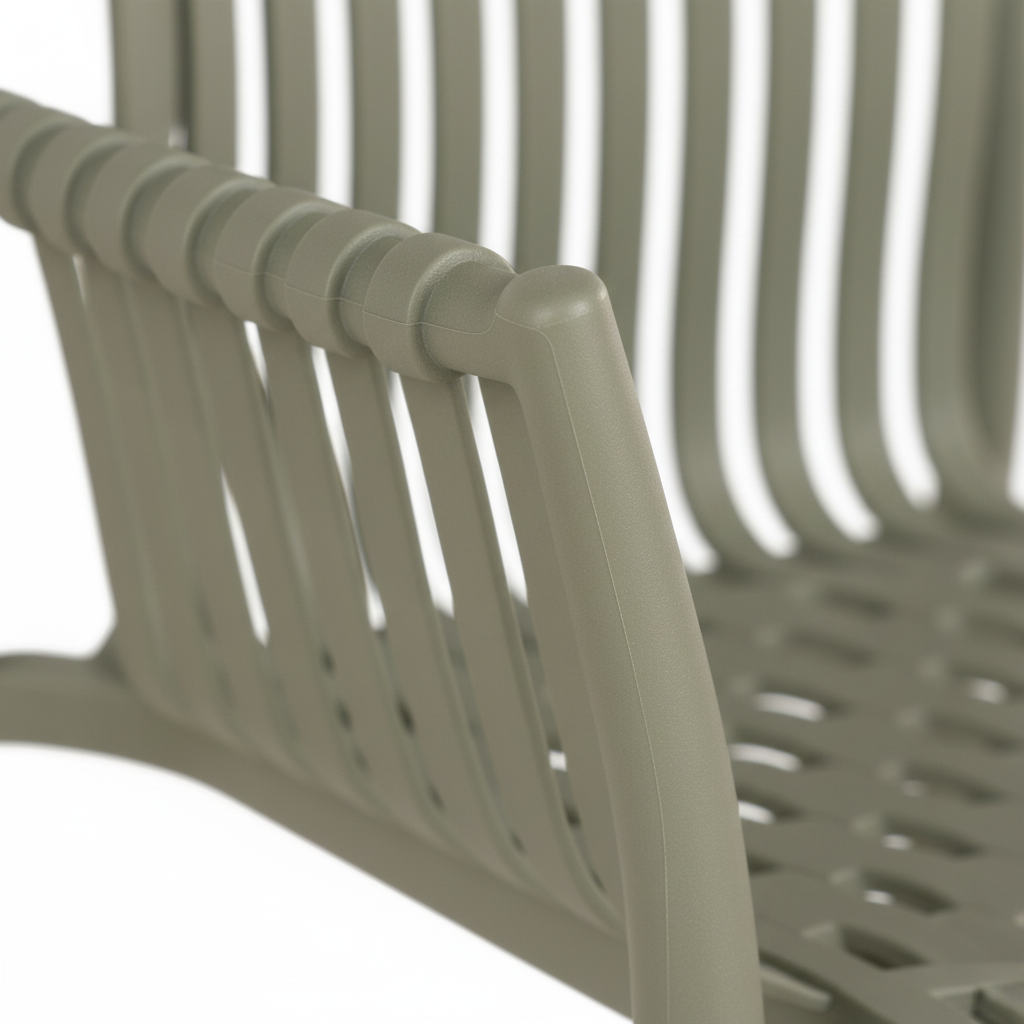 Med UV bestandig polypropylen og stabelbar løsning får du en stol som er laget for daglig bruk utendørs og som holder godt på fargen over tid. Den åpne ryggen og de integrerte armlenene gir stolen et lett uttrykk, samtidig som den er behagelig å bruke rundt utebordet.