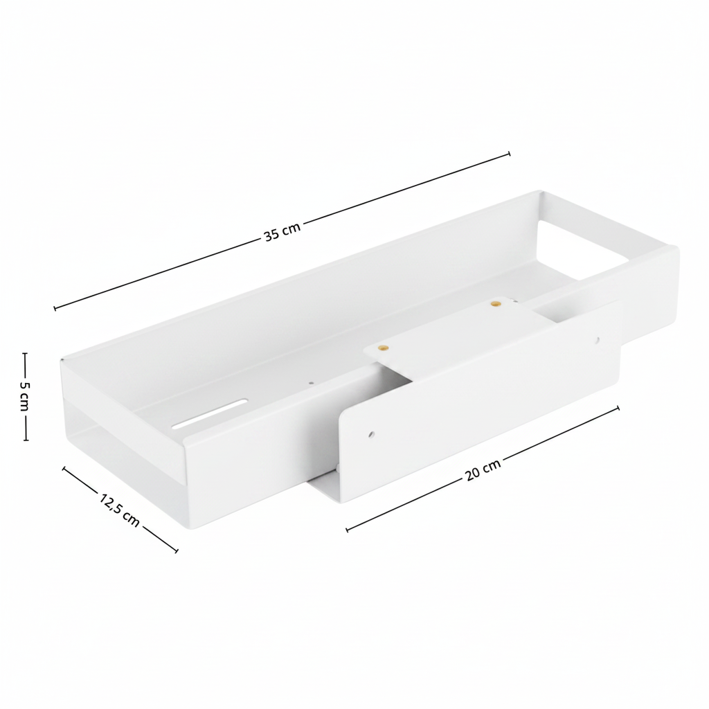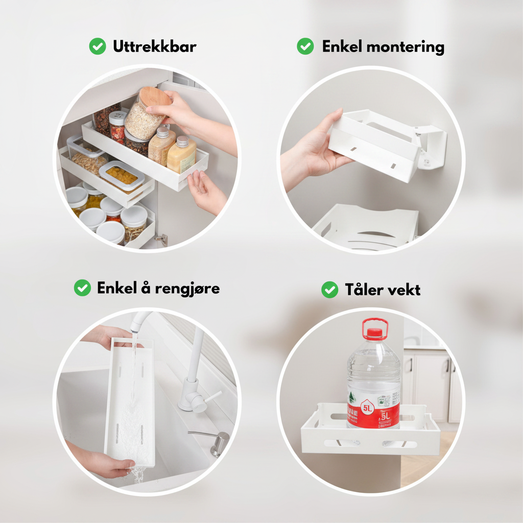 Med bredde på 35 cm og slank dybde på 12,5 cm passer hyllen godt i kjøkkenskap, under vasken, på siden av baderomsinnredningen eller andre smale områder der du trenger mer struktur. Den uttrekkbare funksjonen gjør at du lettere ser og når innholdet, noe som reduserer rot og sparer tid i hverdagen.